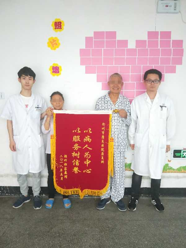 经过十几天的康复训练老胡进步不少,现在可以进一步通过上肢主动辅助运动、下肢主动运动、负重训练、步行训练,再经过1个月的康复治疗,现在的老胡一天比一天好起来了,不但能独立进食,而且能站立起来了,自己还可以慢慢的行走,偶尔还会跟医护人员开开玩笑,这不还有一个星期老胡就可以出院了。为了感谢康复医院的医护人员,出院前老胡的家人高兴地给医护人员送来了锦旗,跟医护人员说:“能够恢复的这么快,太感谢你们了……”