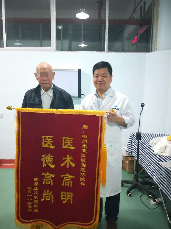 “邵院长,你看我这老头子又来衢州康复医院了。但我这次不是来看病的,我们这次是专门来谢谢你的!谢谢你,谢谢衢州康复医院治好了我的头晕,现在我每顿饭都吃的很香,也不会想呕吐了。”陈爷爷一边说着一边将自己亲自定制的锦旗送到了邵院长的手中。