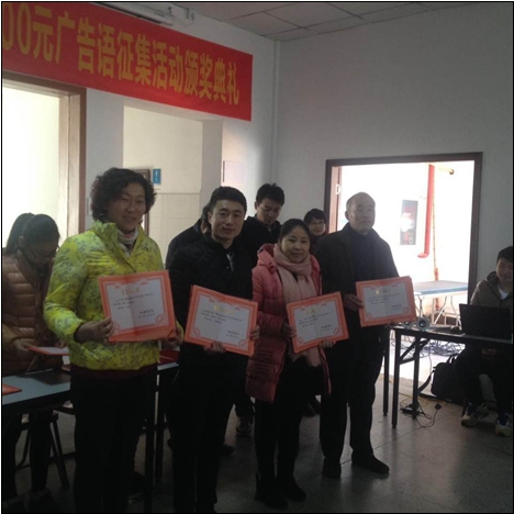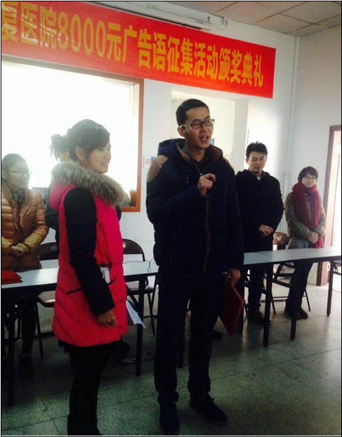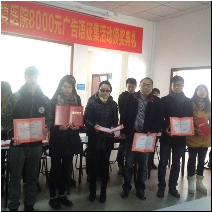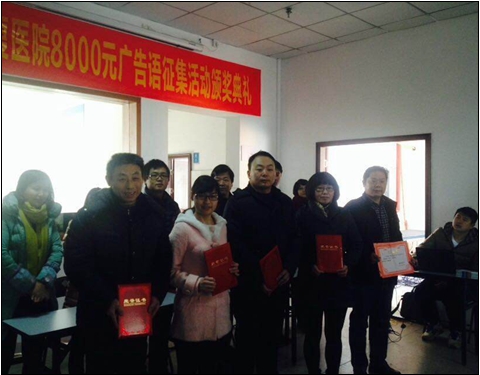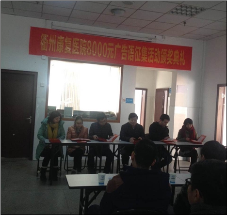 2015年1月2日,衢州康复医院8000元广告语征集活动颁奖典礼于医院门诊大厅举行。上午九点半颁奖典礼正式举行,院长邵志华、康复科主任胡建勇、工会主席许海波、医保科主任邓玉琴、主治医师叶群、主治医师余佩洁等人员出席为本次获奖者颁奖。获奖者名单及广告语公布如下: