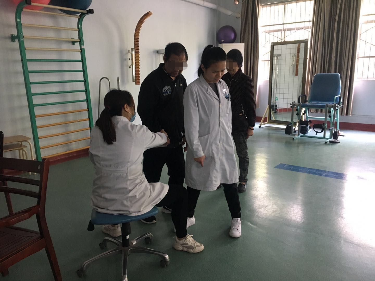 舒先生目前的恢复项目里的主要一项就是行走训练:脚后跟抬起,往上提,然后落下... 但这些看似简单的动作,舒先生做起来却十分艰难。夏主任解释道:“通常在中风后,臀部和核心肌群,对于站立和行走都是至关重要的。我们给患者做的这些练习,有助于增强这些核心肌肉。就像站立和平衡练习一样,需要通过一个个进步来帮助重建患者的力量和协调。”
