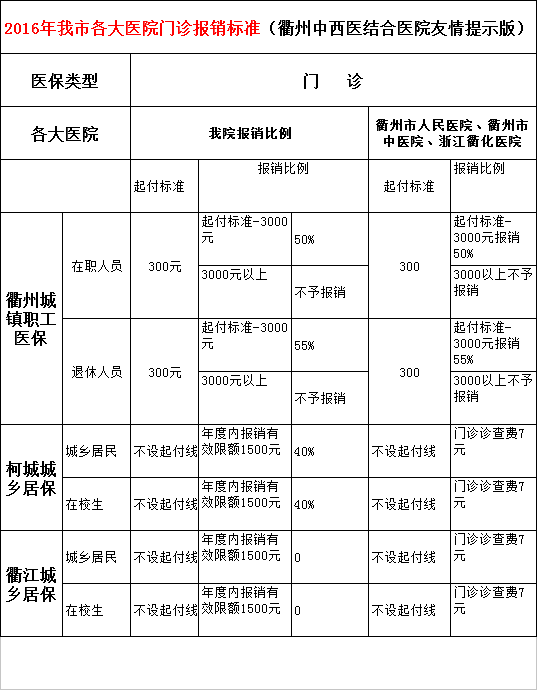 门诊报销优势:相比其他二、三级医院门诊只能报销7元的门诊挂号费,城区城乡居民在衢州中西医结合医院门诊报销不设起付线的优势,且年度内报销有效限额为1500元,报销比例为40%